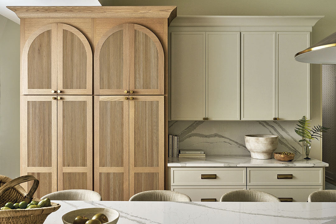 Of special note is a corner countertop cabinet richly stained in a warm hue. It features a combination of reeded glass and reeded wood doors that provide visual and physical texture in addition to what is provided by the wood’s grain pattern. Thompson repeated the reeding in the arched doors of the pantry cabinet sited around the kitchen’s perimeter.