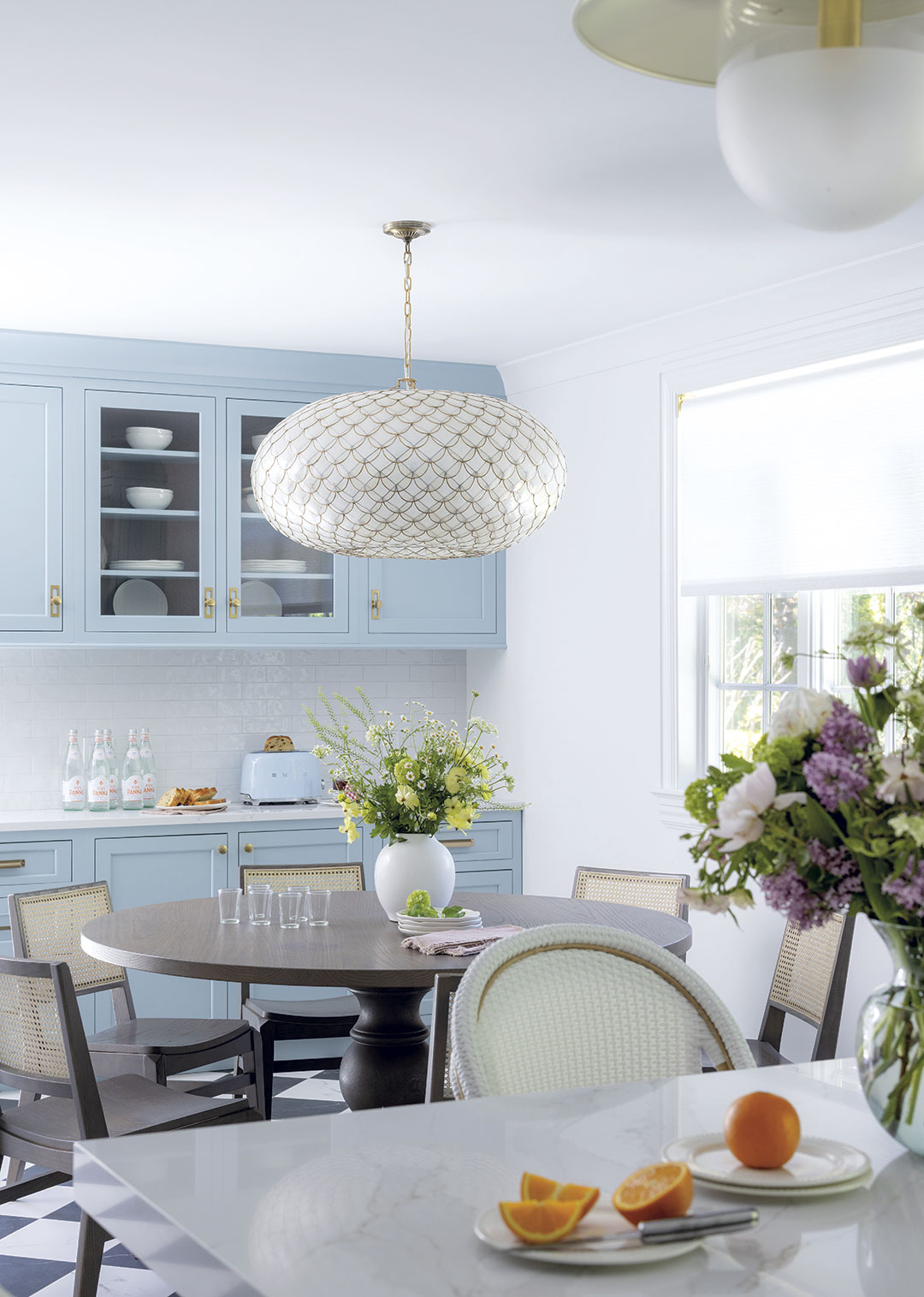 “In this kitchen, each element we chose creates a layered, cohesive look that is very intentional without being overdone,” the designer indicates. “On paper, describing this kitchen as a space with blue cabinets and a checkerboard floor may sound like it’s a bit much, but in reality, it’s a bright and airy space with personality and warmth…made all the more beautiful by the textural elements we included.”