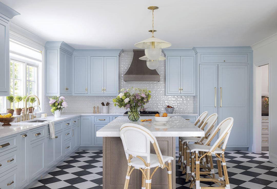 To accomplish that goal, Morgan based the kitchen on a traditional design style with a foundation of painted powder blue cabinetry.
