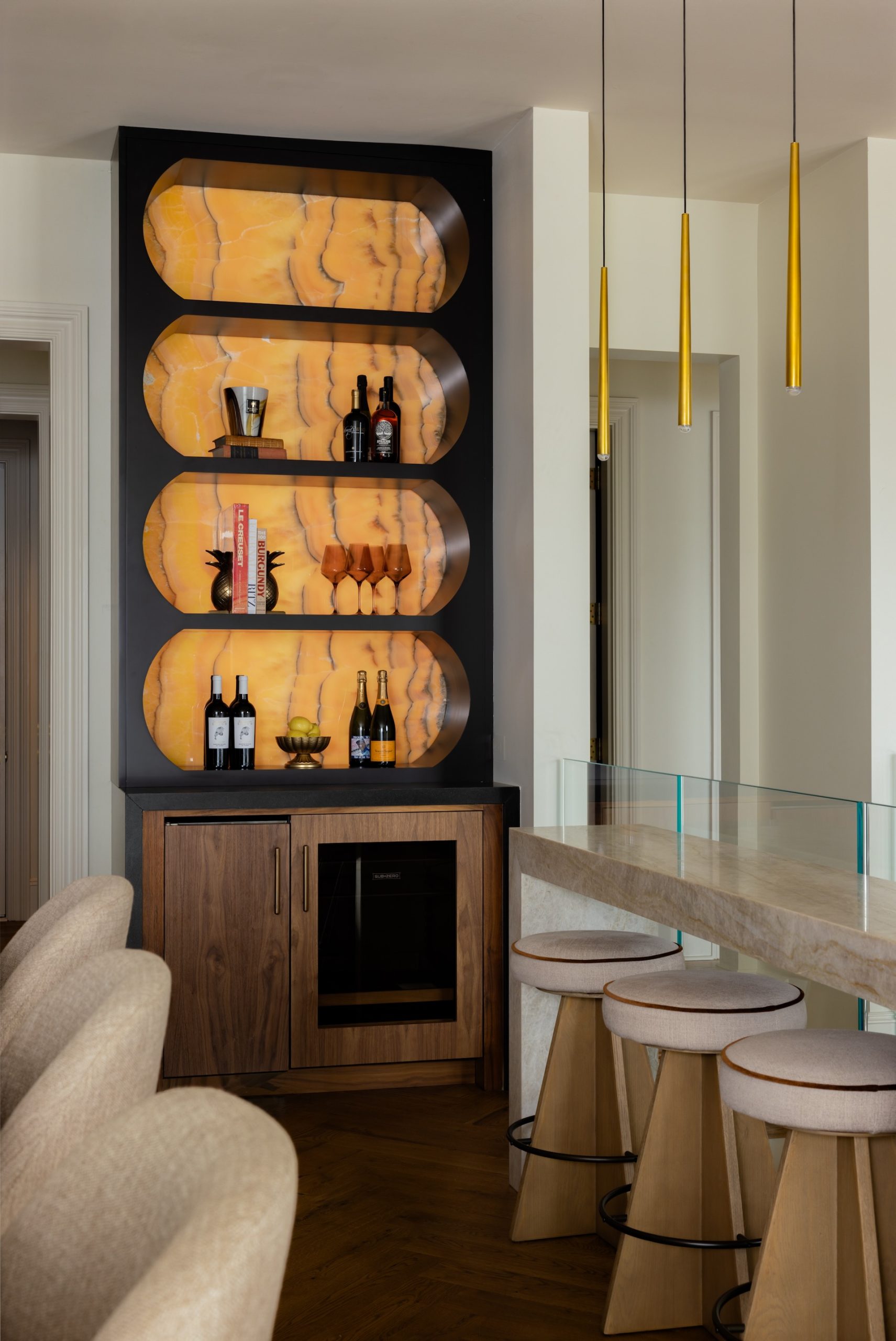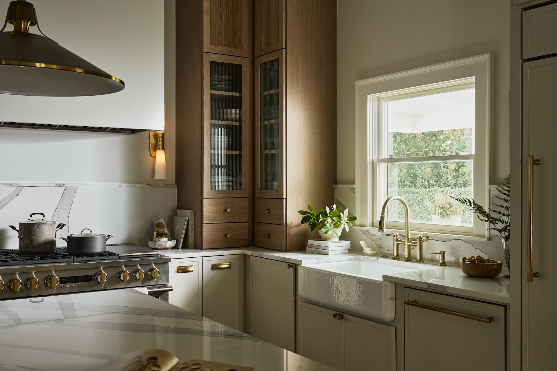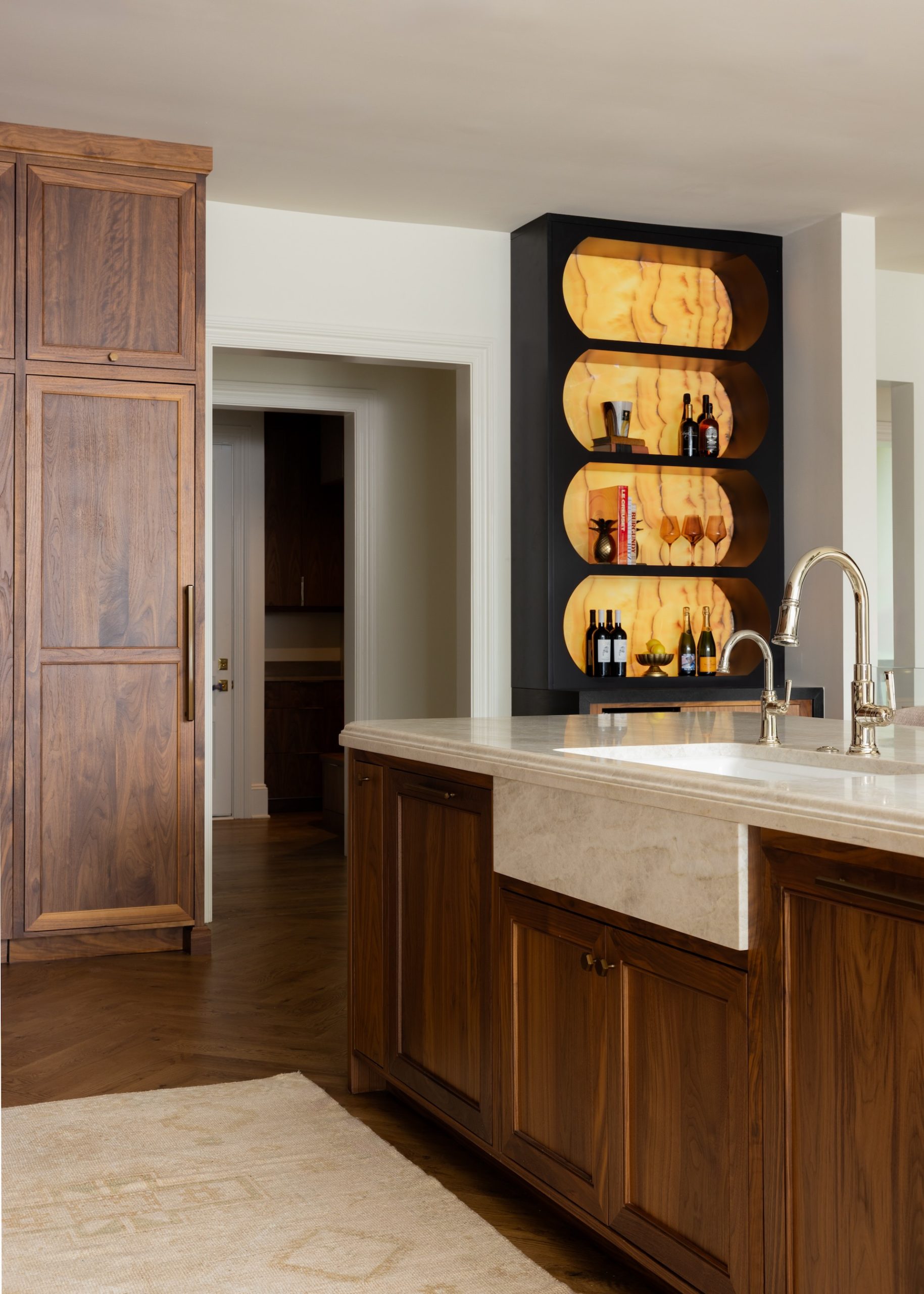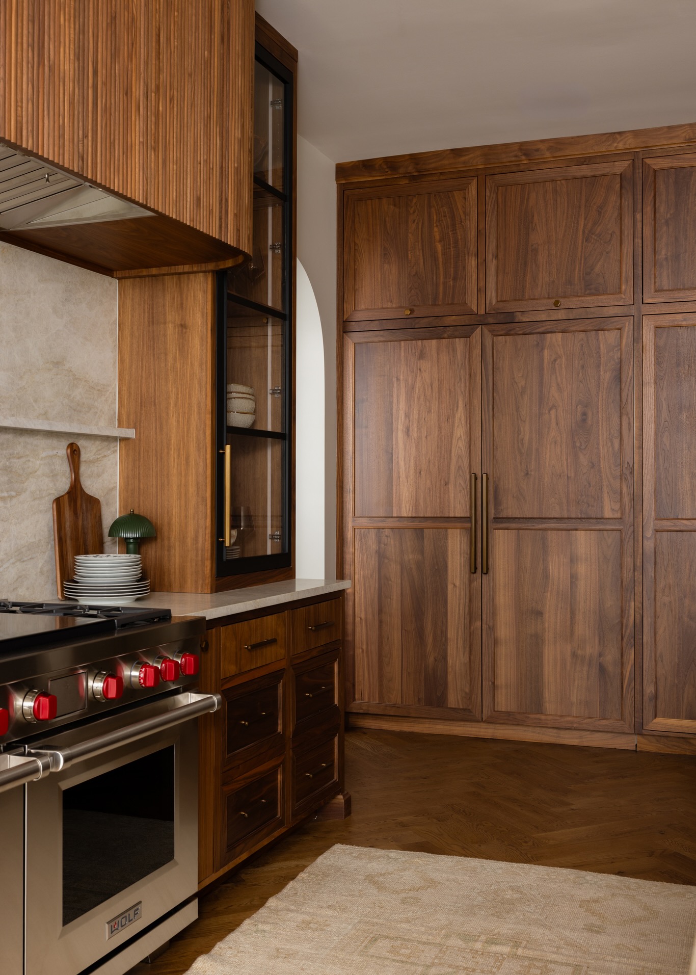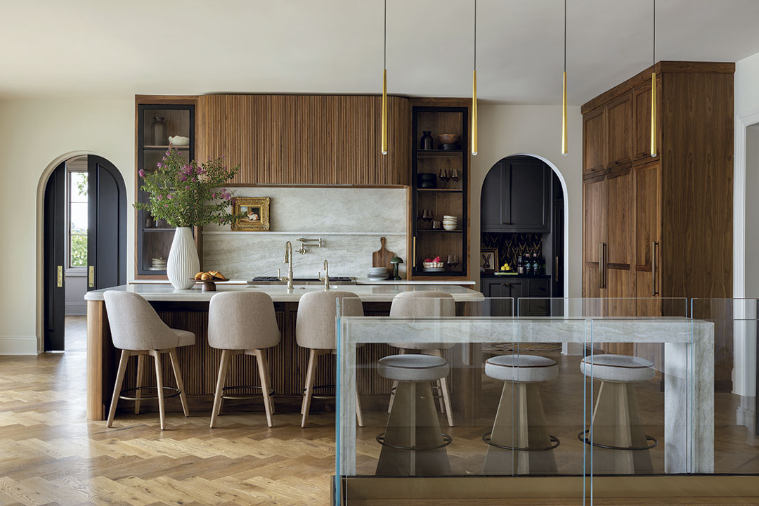 Specifically, the kitchen and adjacent bar boast a thoughtful mix of natural and refined materials. Warm walnut cabinetry (from Walker Woodworking) and appliance panels that conceal the refrigerator and freezer showcase a vertical grain pattern and combine with the rounded-edge, reeded ventilation hood surround to add depth and visual interest. The hood is flanked by glass-front cabinets with brass accents and black metal- framed doors that bring smooth contrast and structure.