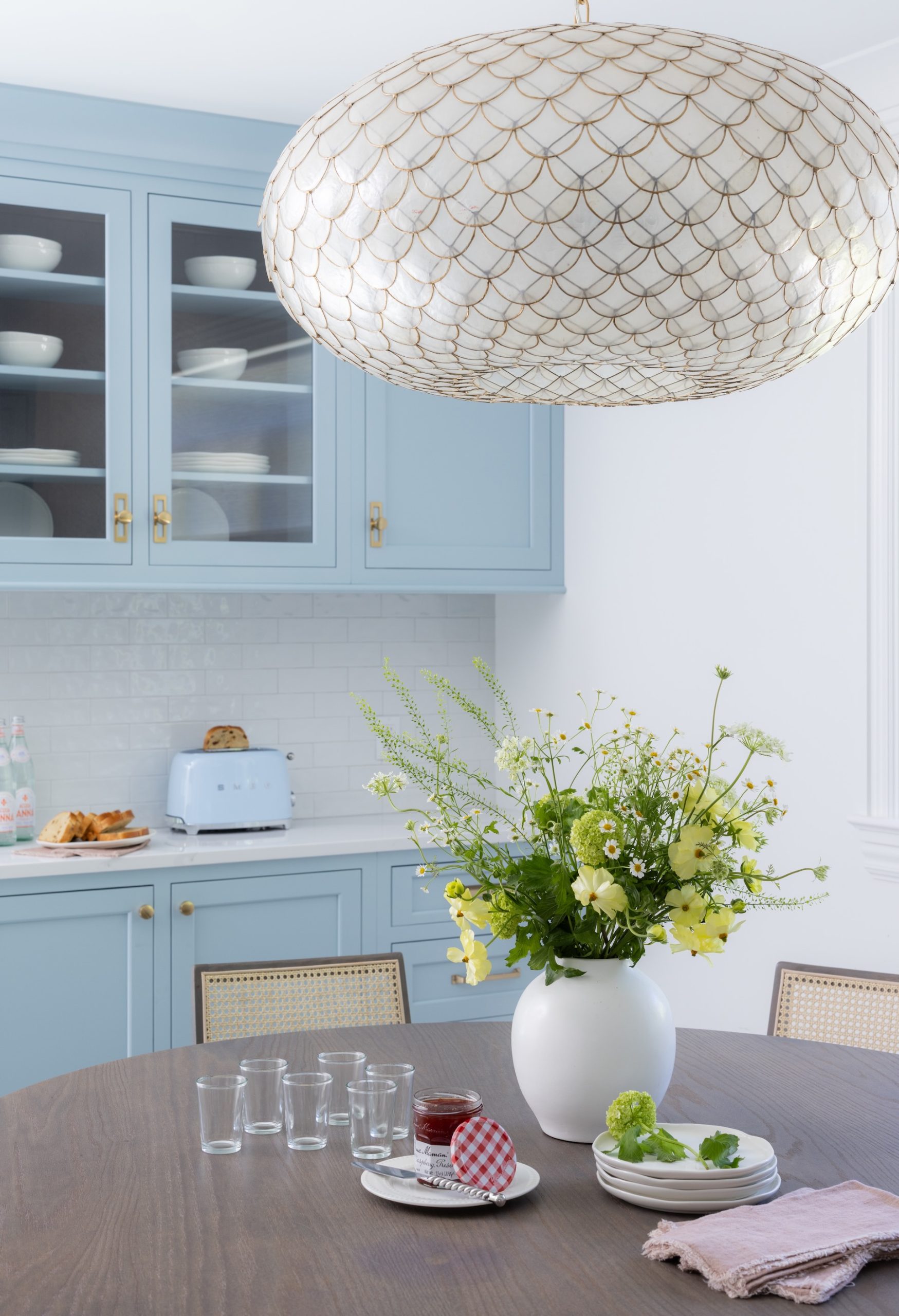 Morgan also brought in texture via the stained cherry ventilation hood surround and matching island, the latter of which is accompanied by heavily textured rattan stools. Directly behind the island sits a dining table with cane back chairs that provide seating for the family. A Capiz shell chandelier hovers above and offers a soft glow when illuminated. Additionally, more subtle texture is provided by the cabinetry hardware, which is a mix of brass knobs and pulls with understated nail head accents.